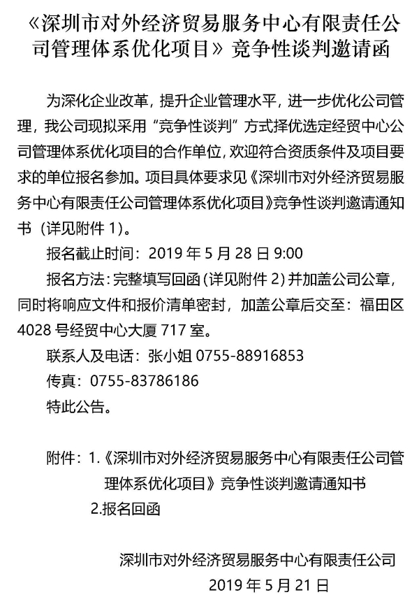 深圳市对外经济贸易服务中心有限责任公司管理体系优化项目》竞争性谈判邀请通知书