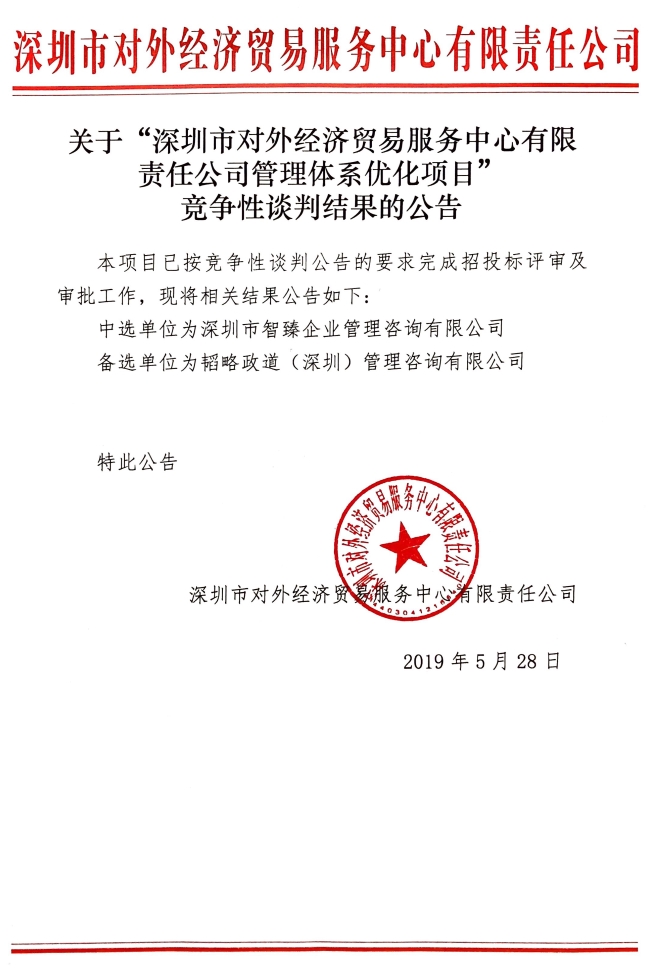 关于“深圳市对外经济贸易服务中心有限责任公司管理体系优化项目”竞争性谈判结果的公告